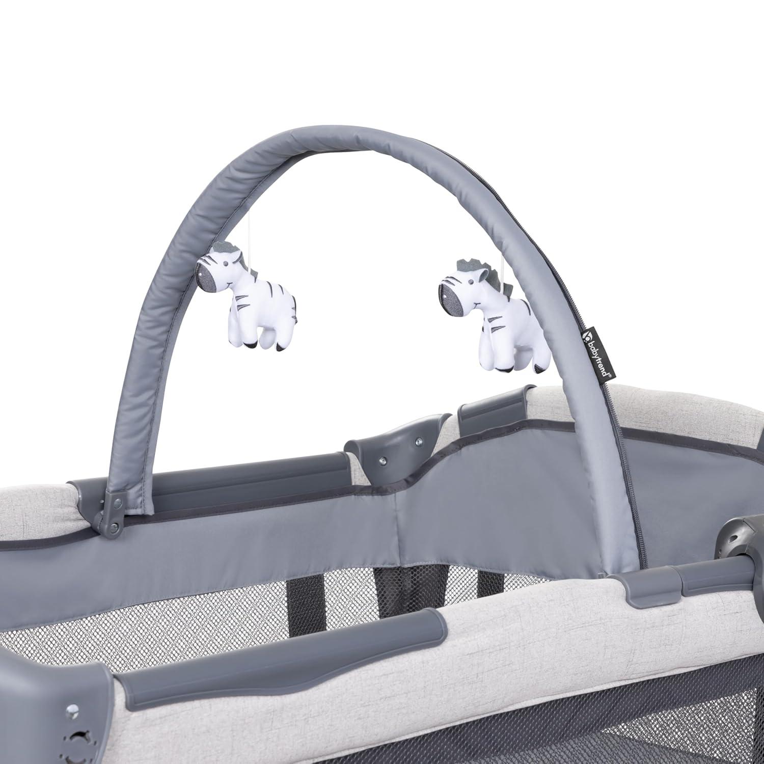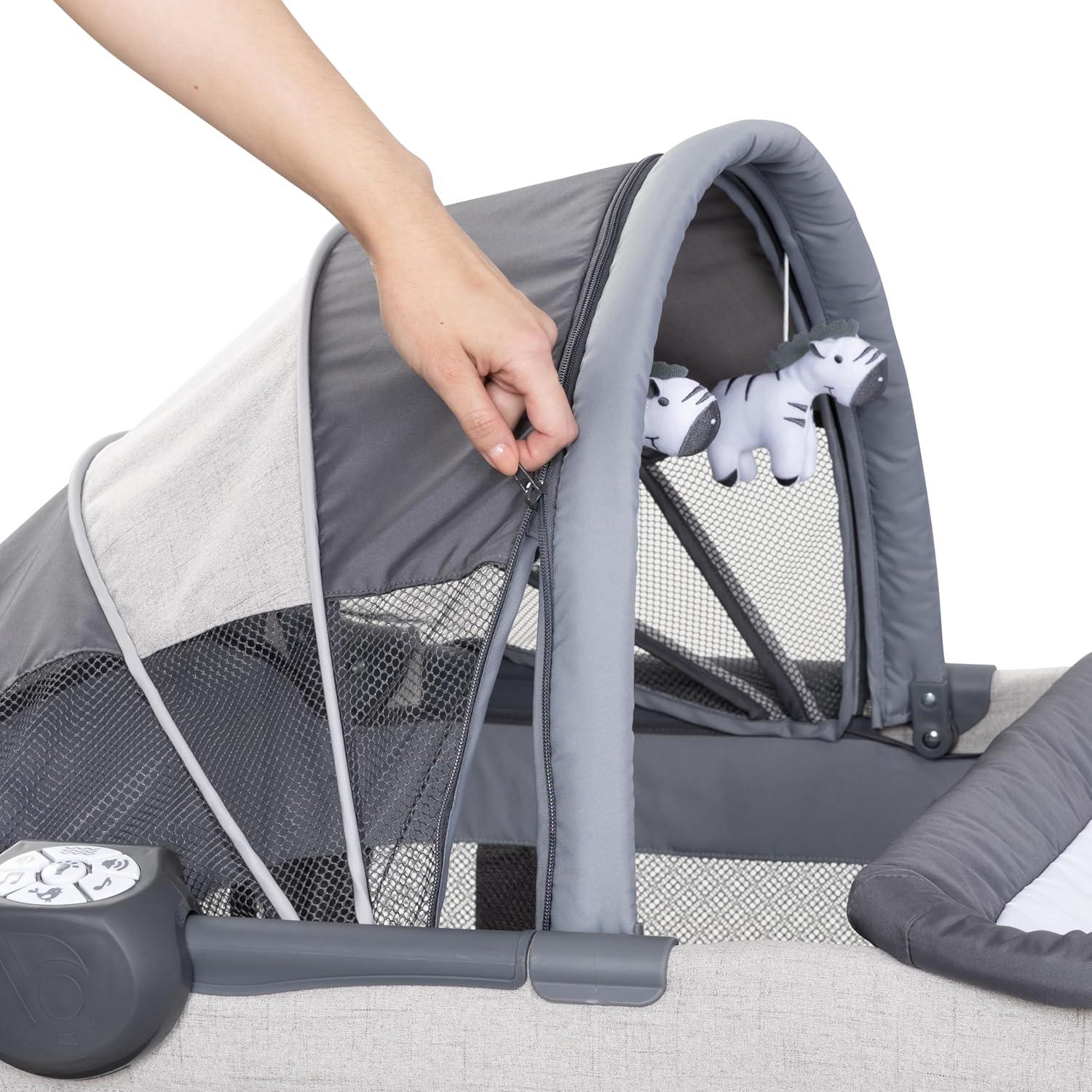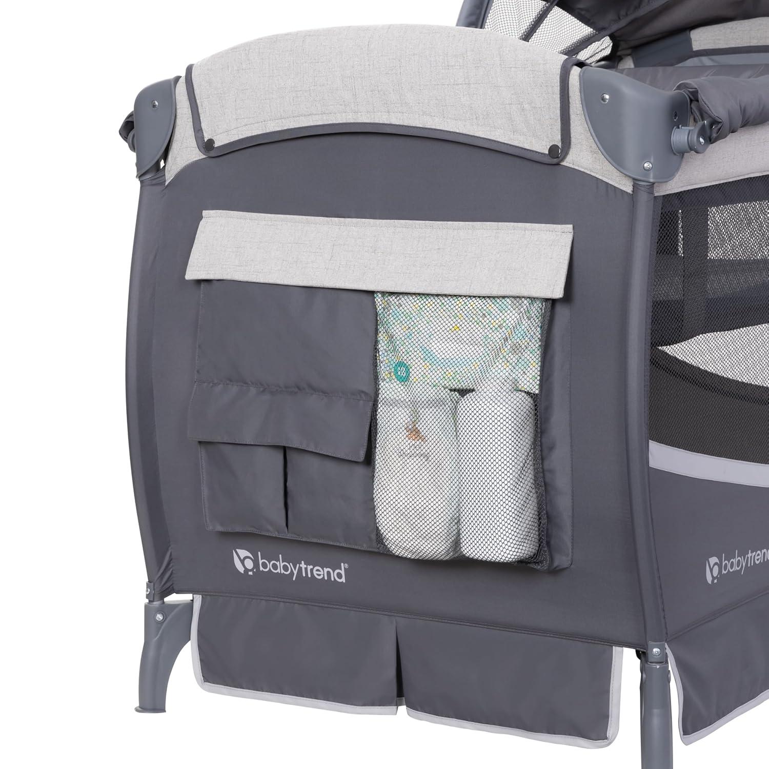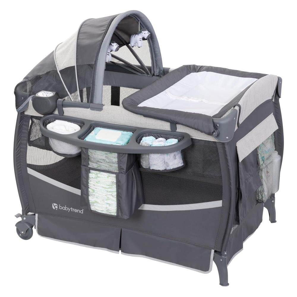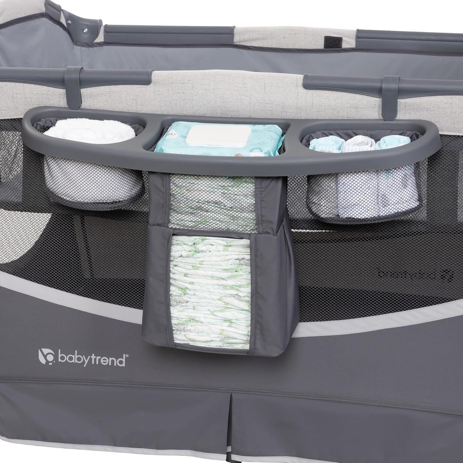 The Baby Trend® Deluxe II Nursery Center is the perfect all-in-one solution for sleeping, diaper changing and playtime! Your newborn will nap peacefully under the shaded canopy after being soothed to sleep by the calming vibrations, night light and peaceful music from the electronic music center. When your little one is awake, simply unzip the canopy to convert it into a toy bar with two plush toys. Diaper changes become a breeze with the changing station, deluxe 3-pocket parent organizer and built-in diaper stacker. The changing table with secure belt conveniently flips over when not in use. As your little one grows, simply remove the bassinet feature and the nursery center is transformed into a safe environment for your child to play. The dual wheels with brakes provide easy mobility and added security. When it's time to travel, simply fold and store the nursery center in the carry tote.