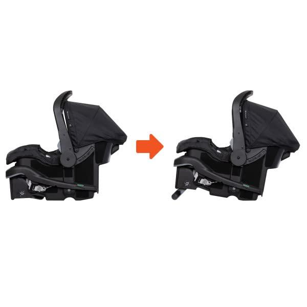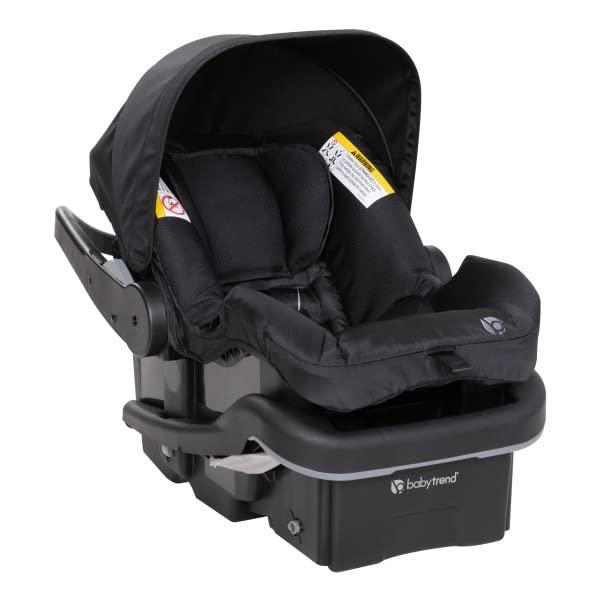 Infant car seat includes EPS energy-absorbing foam for superior side impact head protection and a 5-point safety harness with easy one-hand harness adjustment and push-button release