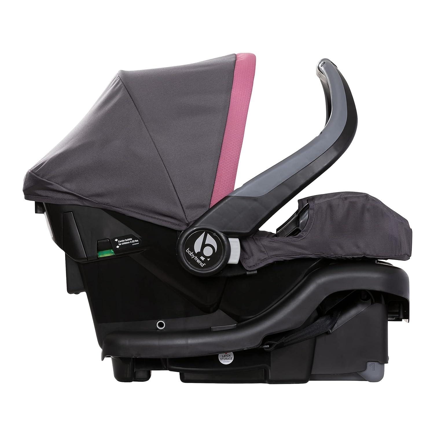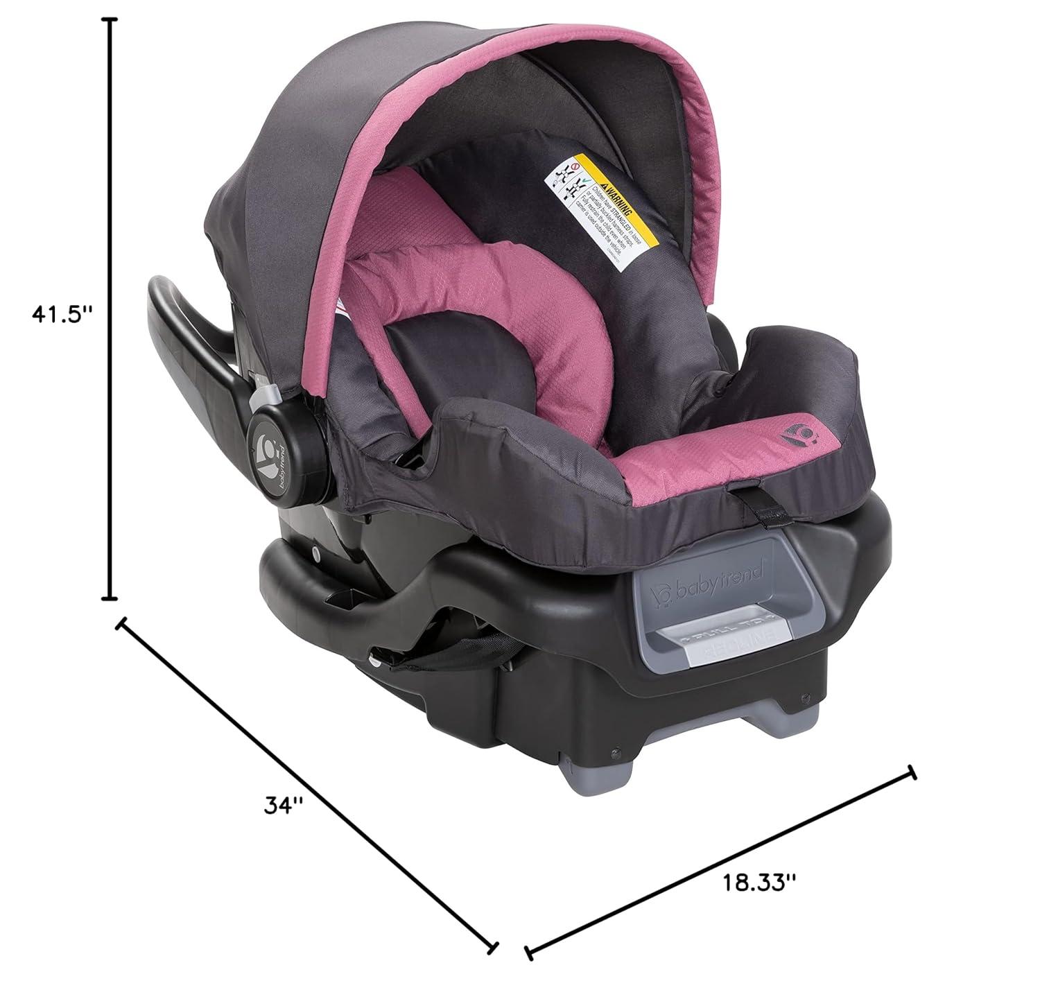 Infant car seat includes EPS energy-absorbing foam for superior side impact head protection and a 5-point safety harness with easy one-hand harness adjustment and push-button release