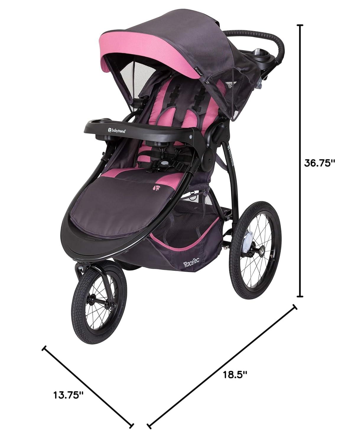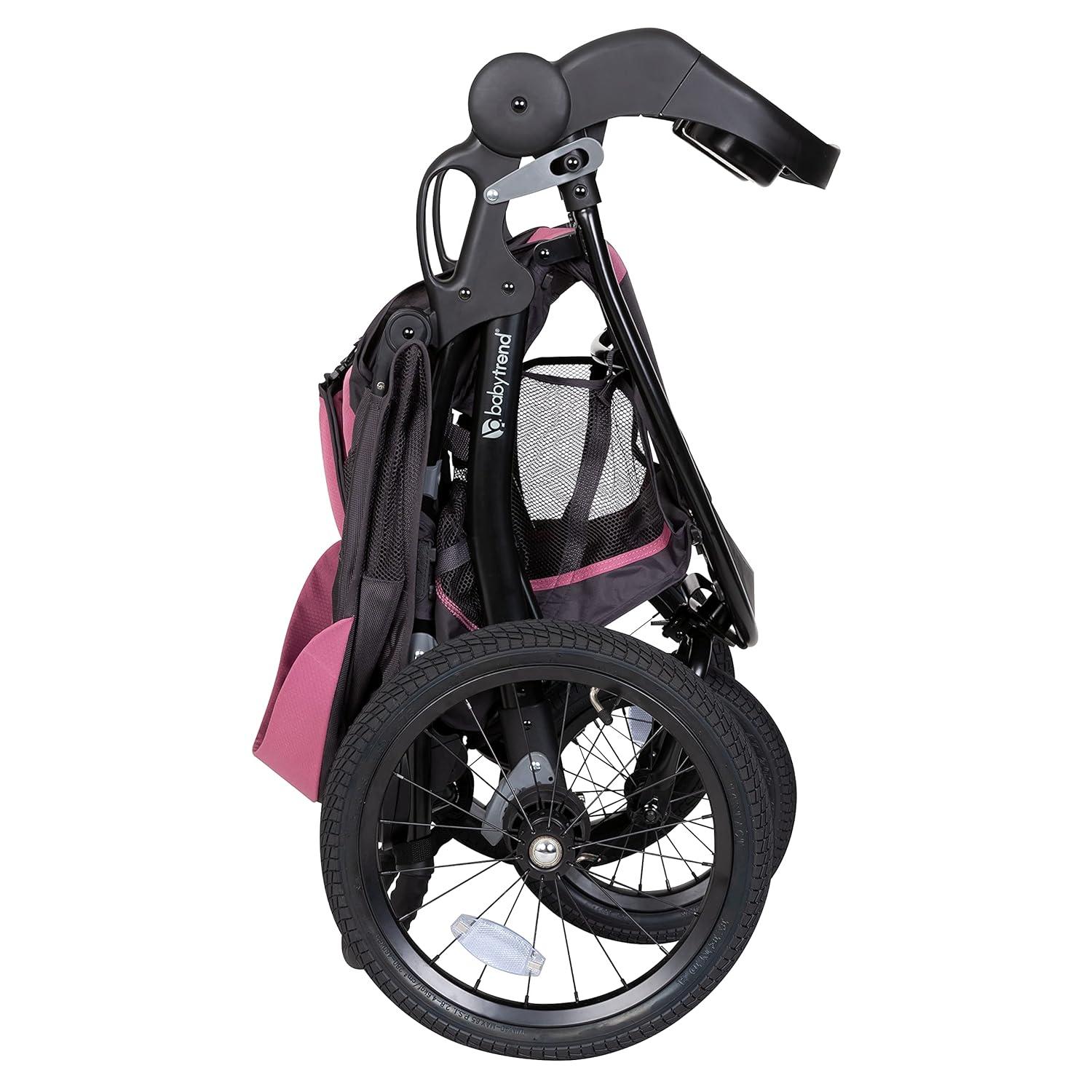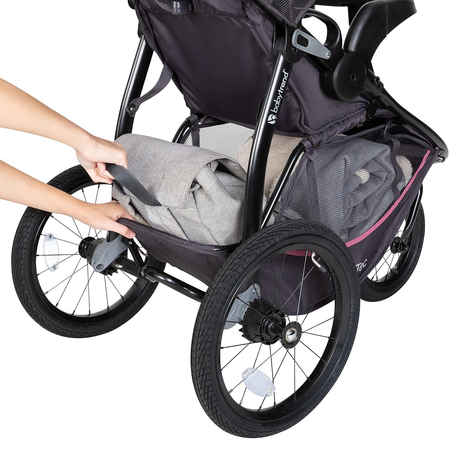 Jog in style with the Baby Trend Expedition DLX Jogger Travel System. Designed with style, safety features, and ease-of-use functions, this sporty jogger guarantees a smooth ride for you and your little one, no matter the destination. Equipped with an adjustable canopy and a peek-a-boo window, this jogger also boasts a large storage basket for essential travel items, a parent tray with 2 cup holders, and a swing away child’s tray with 2 cup holders for drinks and snacks. The jogger also features large 16” all-terrain rear bicycle wheels with air-filled tires. Simply unlock the 12” front swivel wheel for low speed strolling and lock into place to transform into a fully functional jogger. Additional highlights include an extra wide rubber handle, a multiple position reclining seat with a 5-point safety harness and tether strap. This travel system also includes the Baby Trend® Ally™ 35 Infant Car Seat, which provides the latest innovations in safety, design and comfort. This infant car seat has a 35 pound maximum infant weight rating and comes equipped with a deluxe seat pad and reversible infant insert. For added security, Ally™ 35 is engineered with higher, deeper side wings with EPS foam for optimal side impact protection. Other safety features include a 5-point safety harness with one-hand adjustment, a 4-position height adjustable base with dual bubble level indicators and a 6-position crotch belt adjustment.