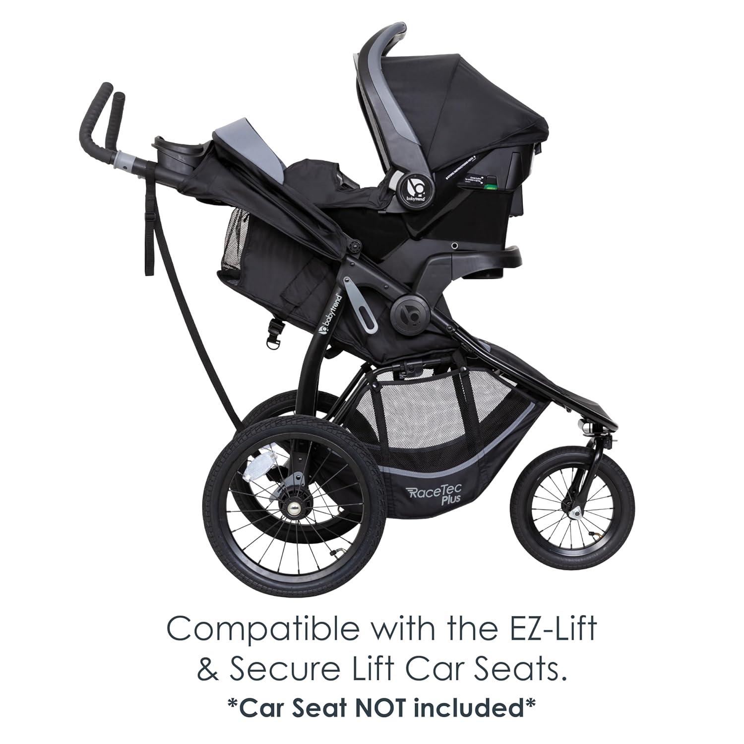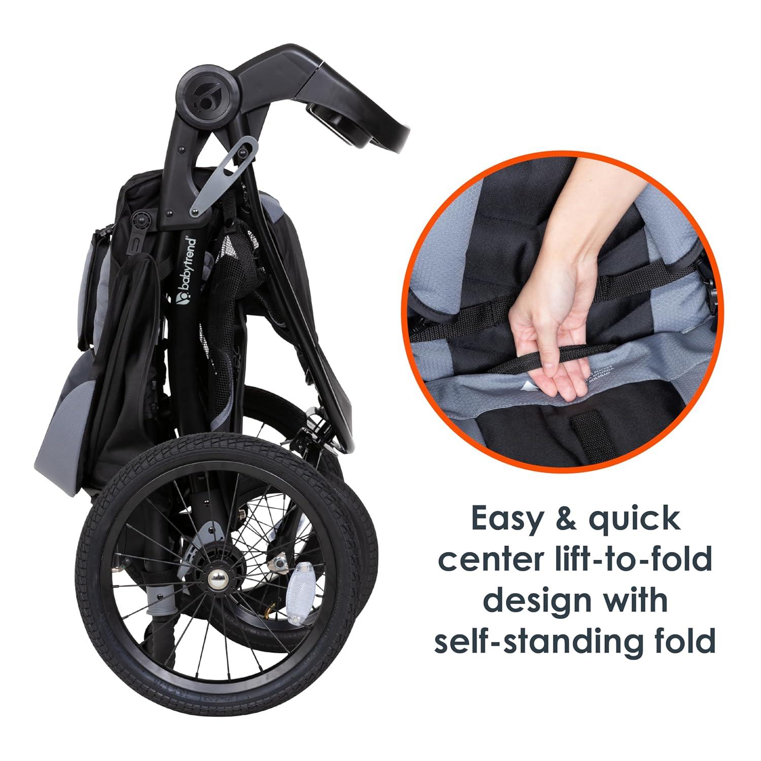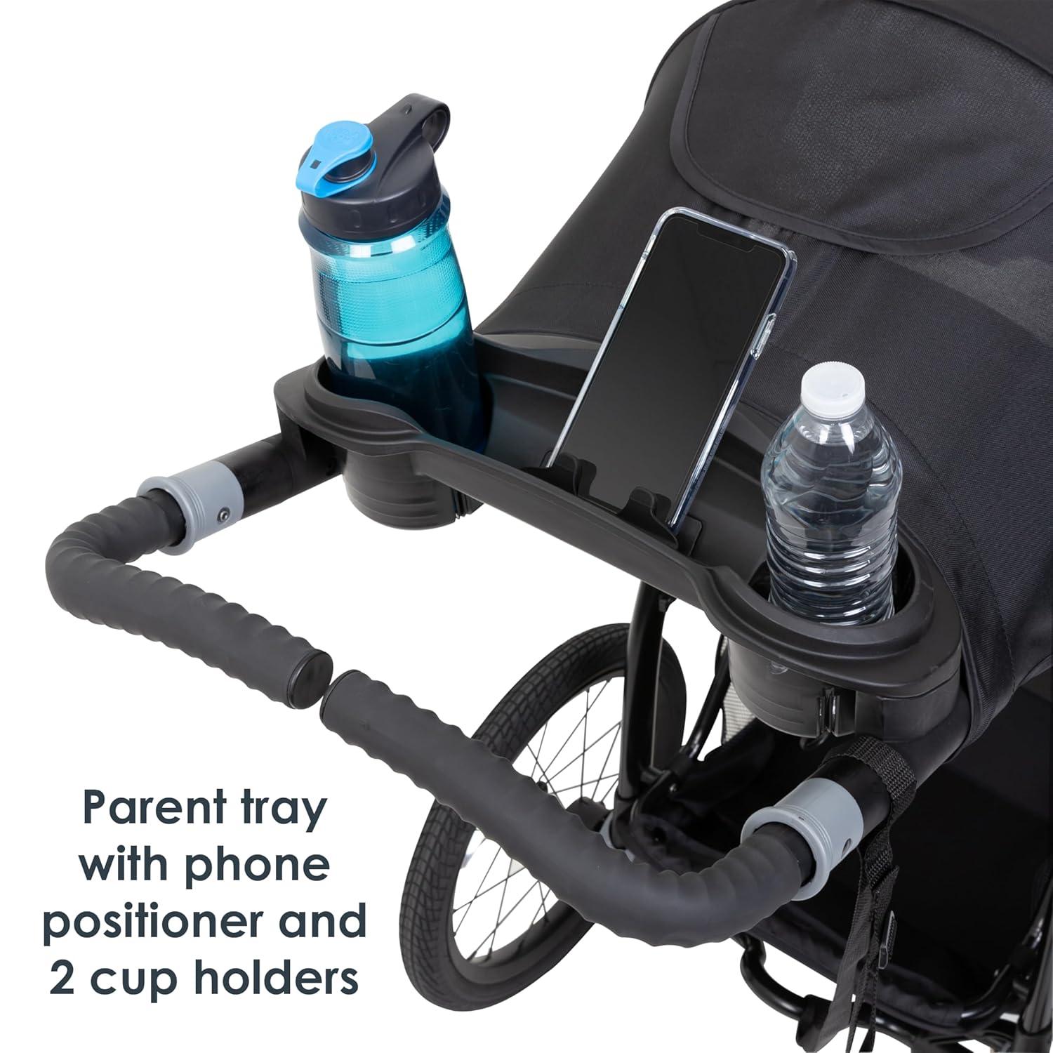Jog in style with the Baby Trend Expedition DLX Jogger Travel System. Designed with style, safety features, and ease-of-use functions, this sporty jogger guarantees a smooth ride for you and your little one, no matter the destination. Equipped with an adjustable canopy and a peek-a-boo window, this jogger also boasts a large storage basket for essential travel items, a parent tray with 2 cup holders, and a swing away child’s tray with 2 cup holders for drinks and snacks. The jogger also features large 16” all-terrain rear bicycle wheels with air-filled tires. Simply unlock the 12” front swivel wheel for low speed strolling and lock into place to transform into a fully functional jogger. Additional highlights include an extra wide rubber handle, a multiple position reclining seat with a 5-point safety harness and tether strap. This travel system also includes the Baby Trend® Ally™ 35 Infant Car Seat, which provides the latest innovations in safety, design and comfort. This infant car seat has a 35 pound maximum infant weight rating and comes equipped with a deluxe seat pad and reversible infant insert. For added security, Ally™ 35 is engineered with higher, deeper side wings with EPS foam for optimal side impact protection. Other safety features include a 5-point safety harness with one-hand adjustment, a 4-position height adjustable base with dual bubble level indicators and a 6-position crotch belt adjustment.
