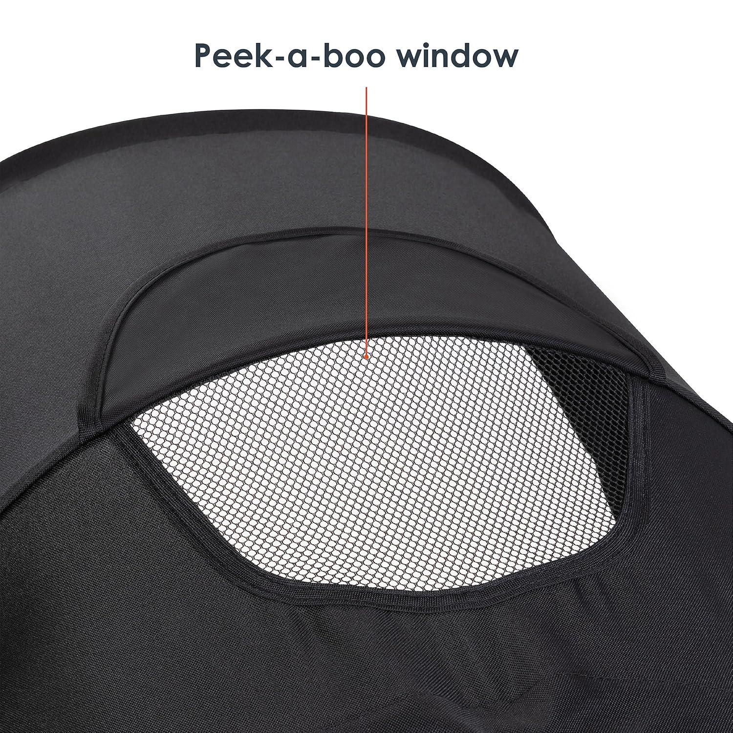 Infant car seat includes EPS energy-absorbing foam for superior side impact head protection and a 5-point safety harness with easy one-hand harness adjustment and push-button release