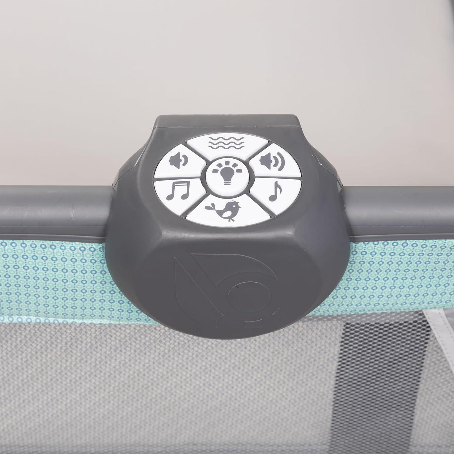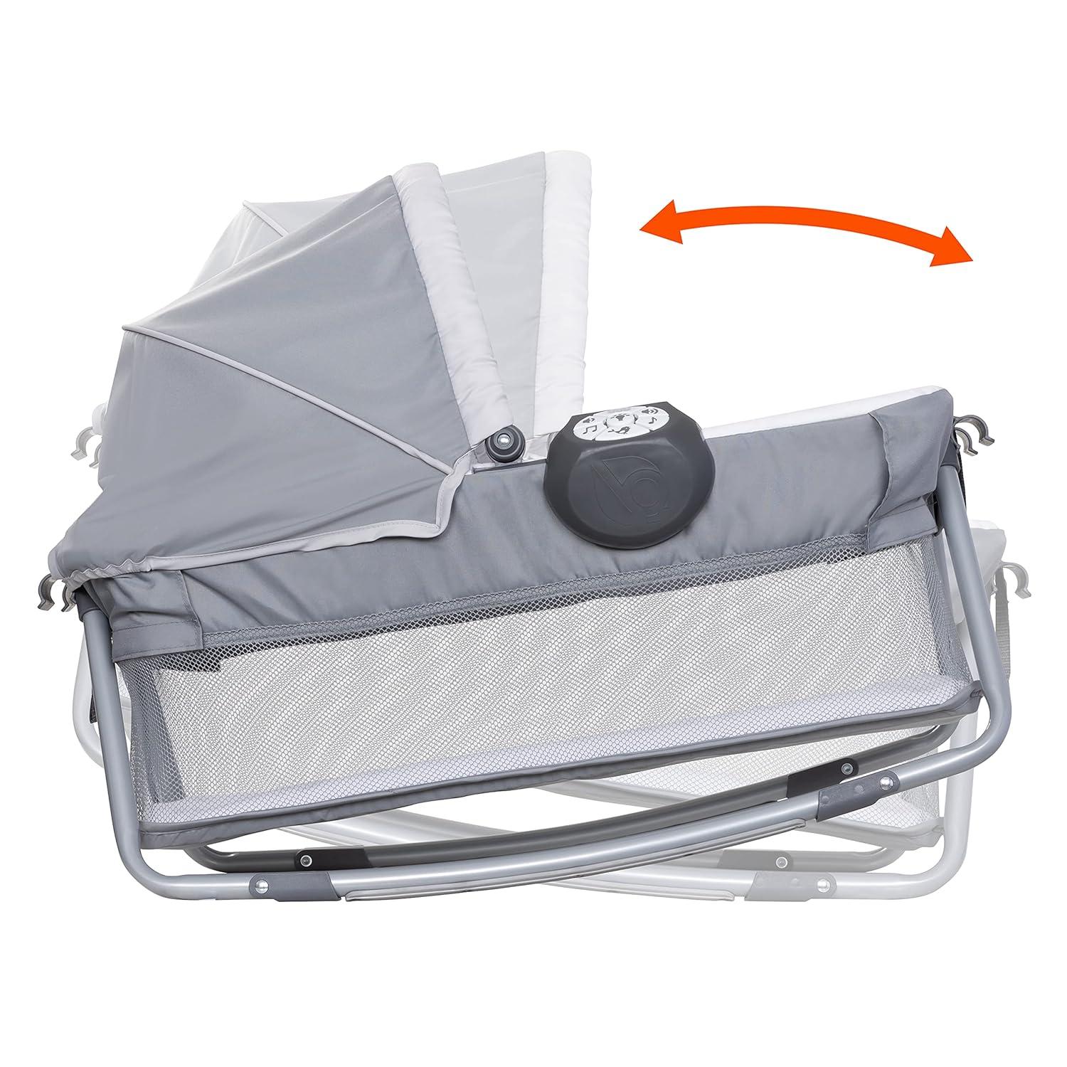 Includes removable and spacious portable cradle with rocking and stationary modes; cradle comes with canopy and carry handle, plush fabric and mesh sides for proper ventilation, and two plush hanging toys to encourage grasping and reaching