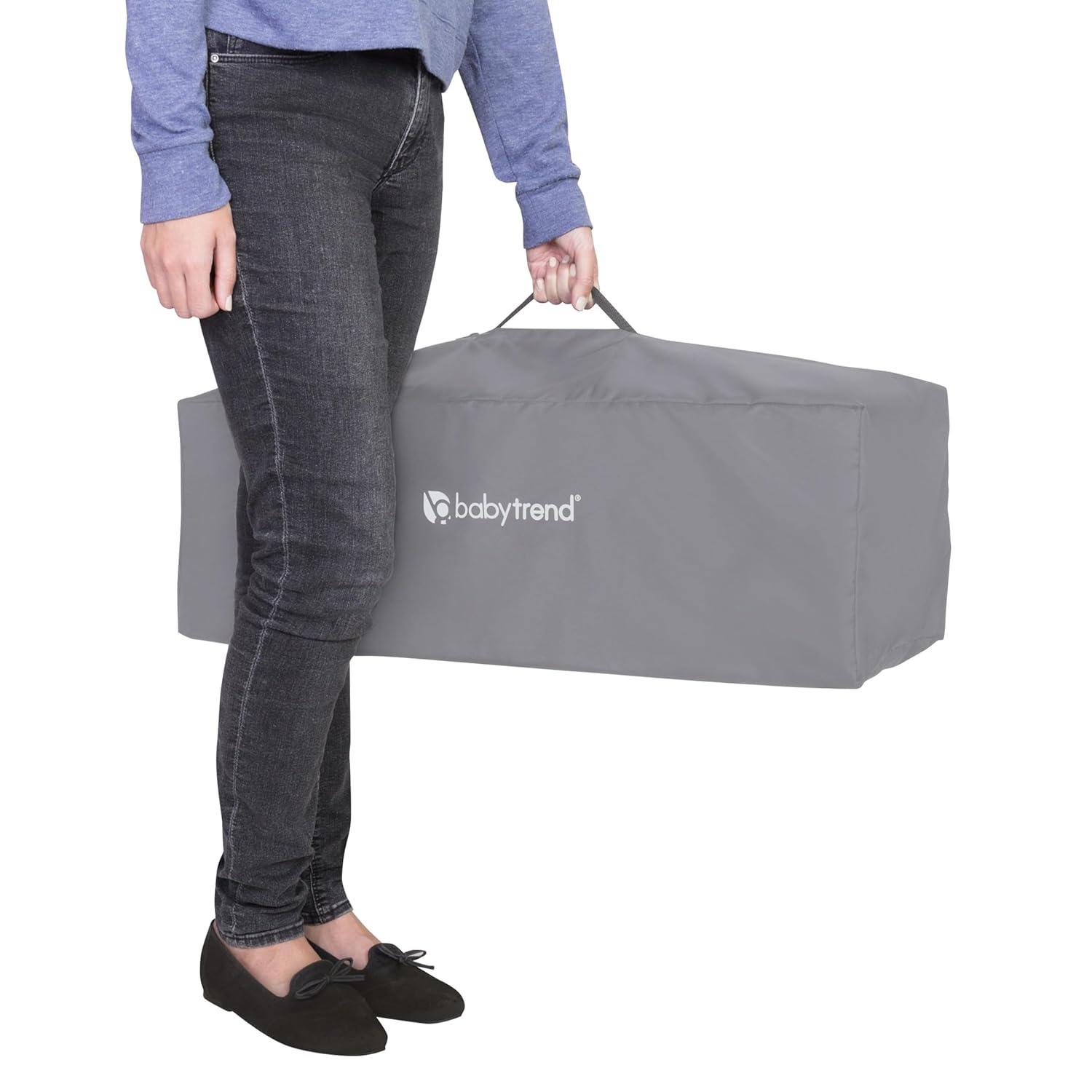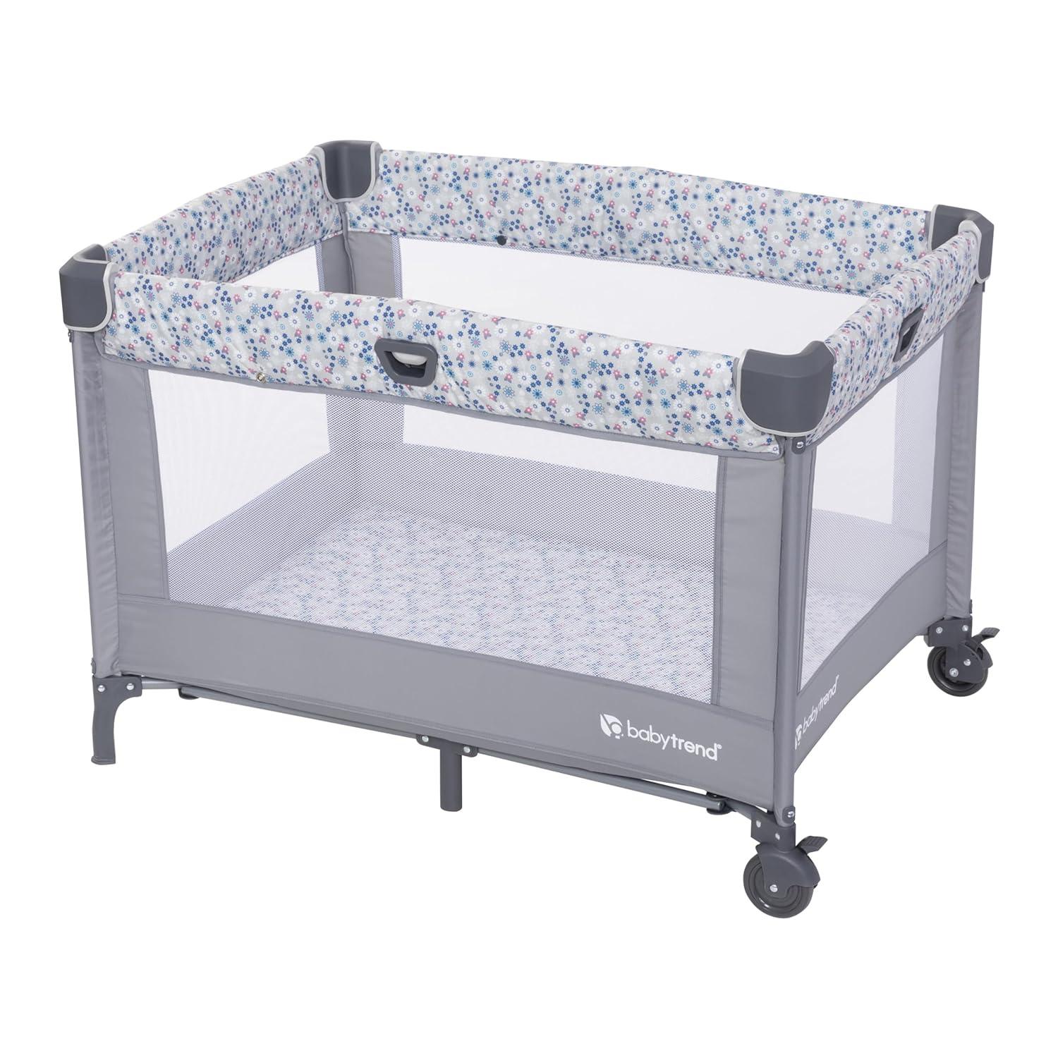 The Baby Trend Nursery Den Playard with Rocking Cradle offers your family various nap time and playtime options as your little one grows! The standalone rocking napper with a canopy and carry handle is the perfect portable option to keep your baby restful even when on the go. Diaper time is a breeze with the flip away changing table and diaper stacker for changing essentials. The removable full-size bassinet transforms into a convenient play time center as your child grows. The integrated Fold-Assist Technology includes a flex cord mechanism for effortless set-up and takedown of the playard frame. The soft tire wheels with brakes provide added mobility and stability wherever your Nursery Den may go. The compact fold easily fits into the included tote bag for easy travel.