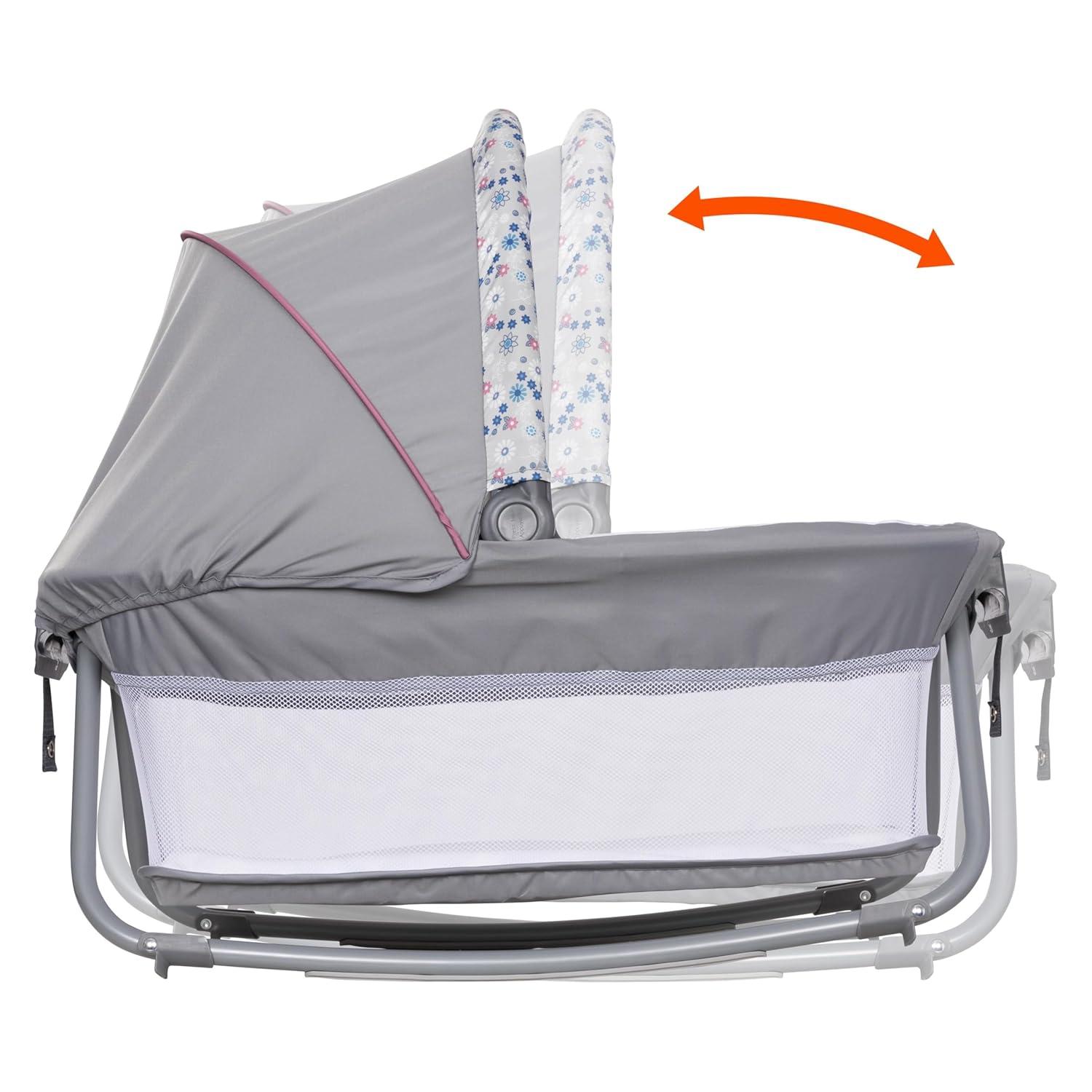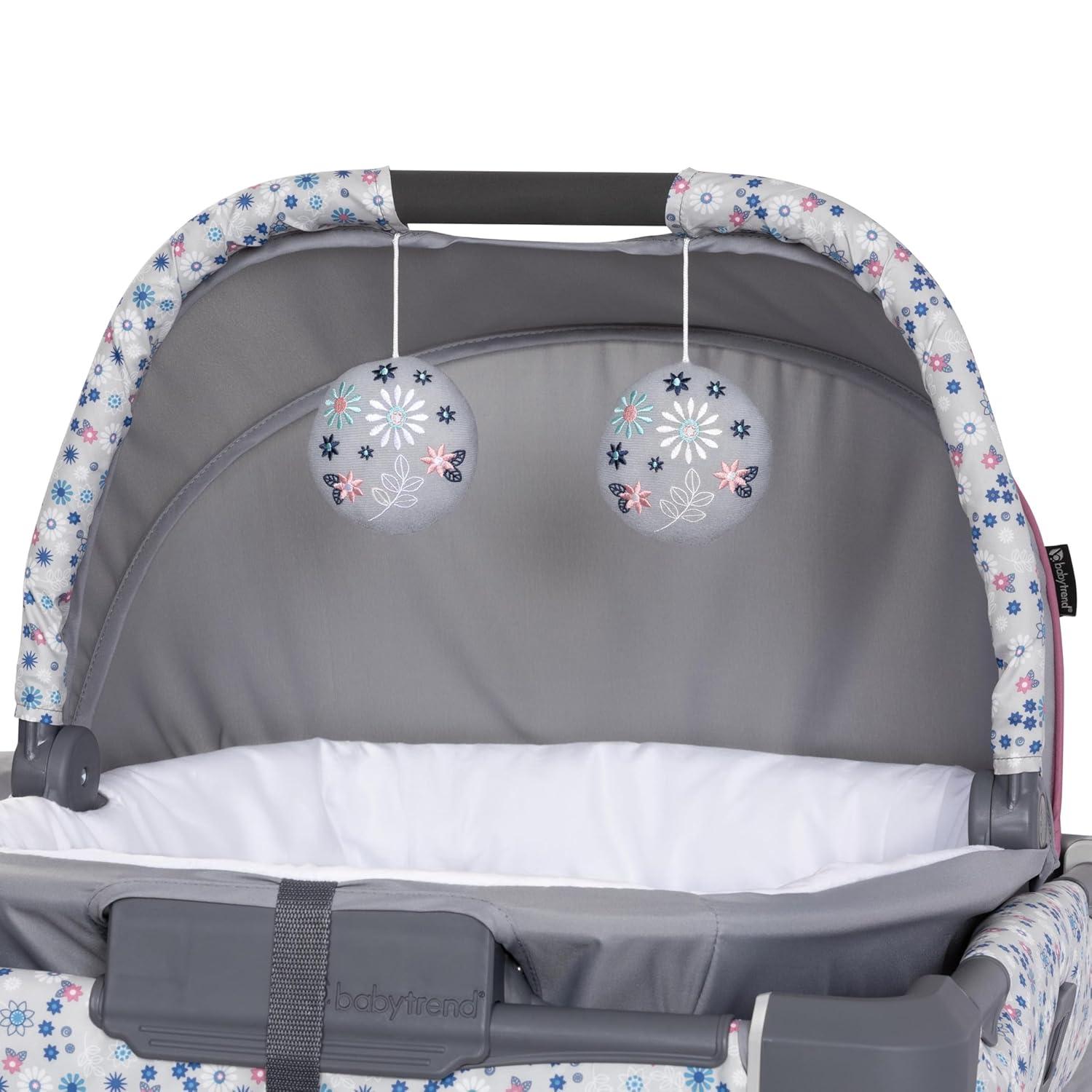 Includes removable and spacious portable cradle with rocking and stationary modes; cradle comes with canopy and carry handle, plush fabric and mesh sides for proper ventilation, and two plush hanging toys to encourage grasping and reaching