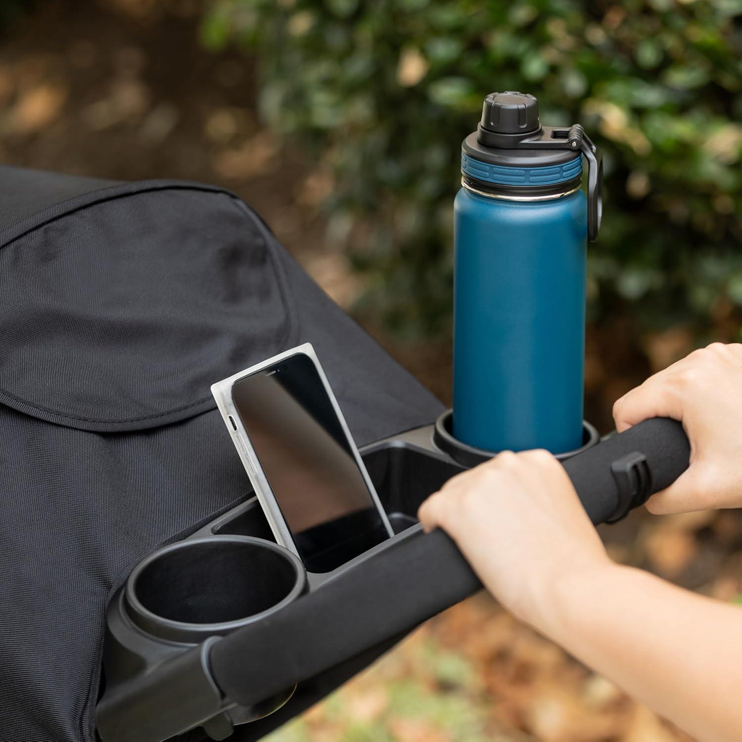 Stroller features a handle with removable leatherette cover for comfort and differing grip options, and a parent tray with two cup holders and center compartment.