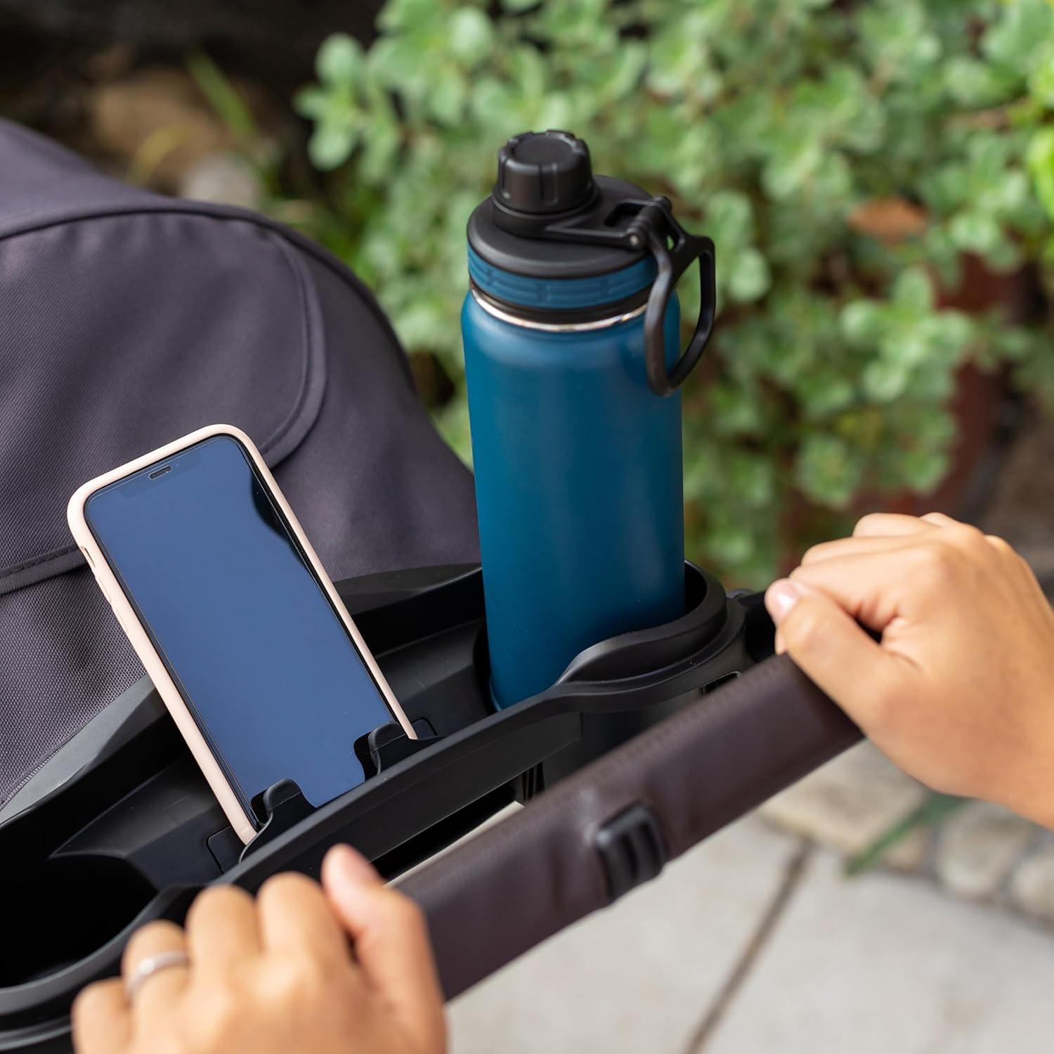 Comfort Cabin with UPF 50+ sun protection canopy, plush fabrics and padding, and child’s tray with two cupholders and center compartment