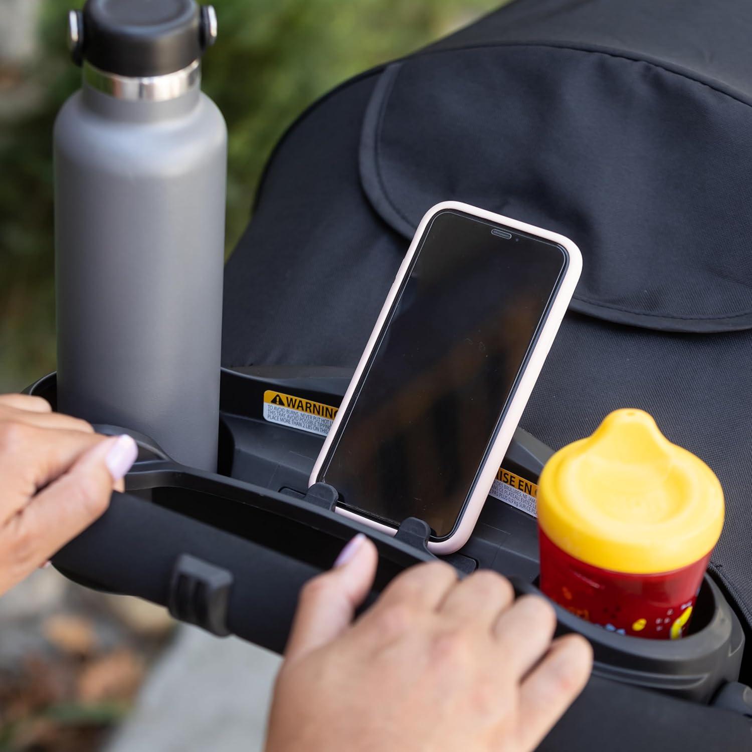 Comfort Cabin with UPF 50+ sun protection canopy, plush fabrics and padding, and child’s tray with two cupholders and center compartment
