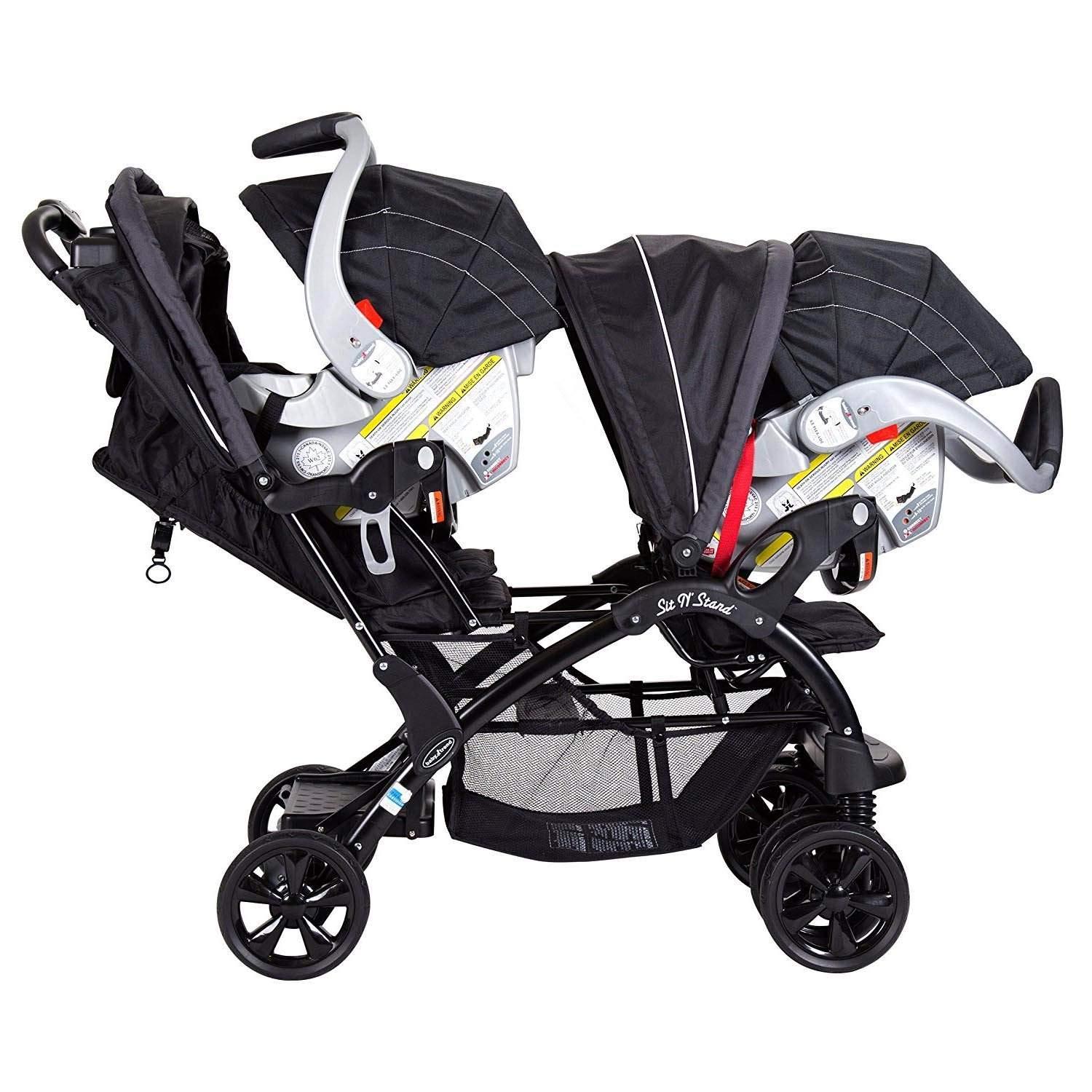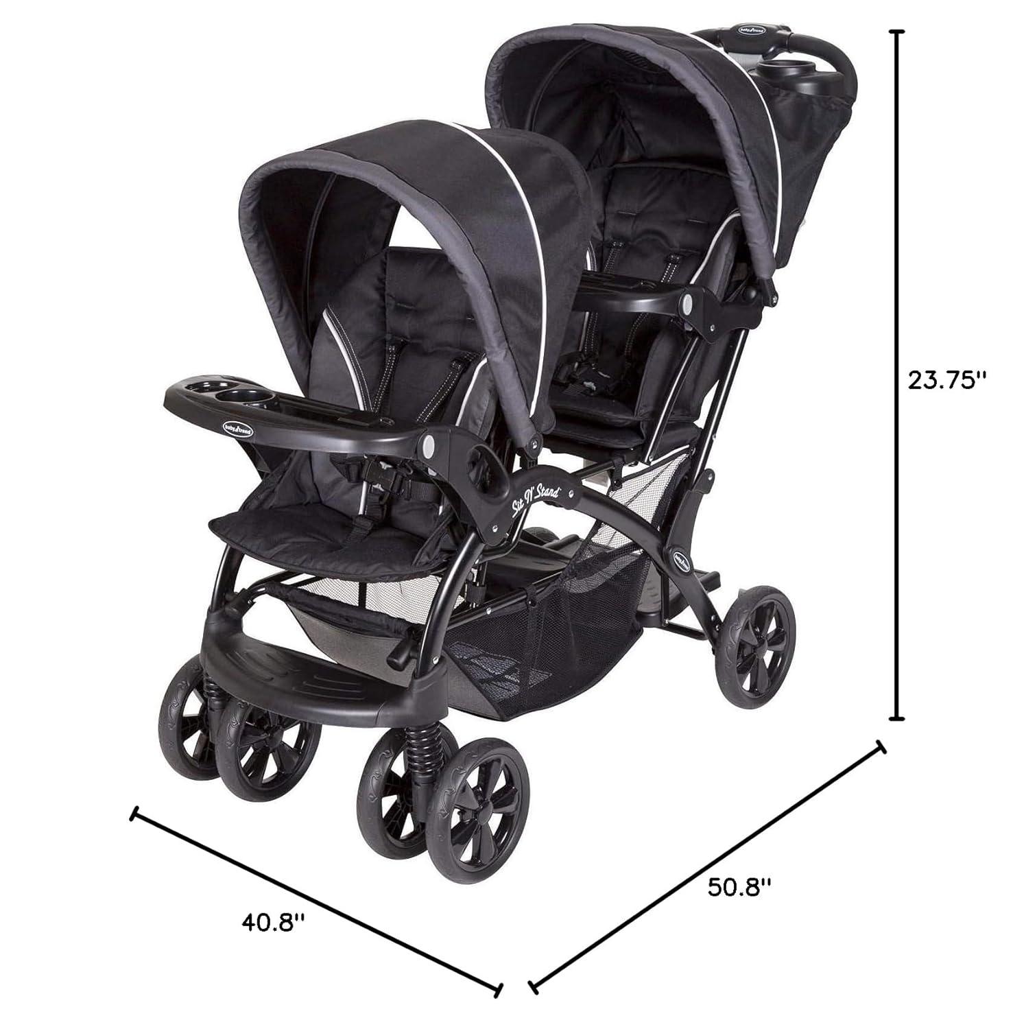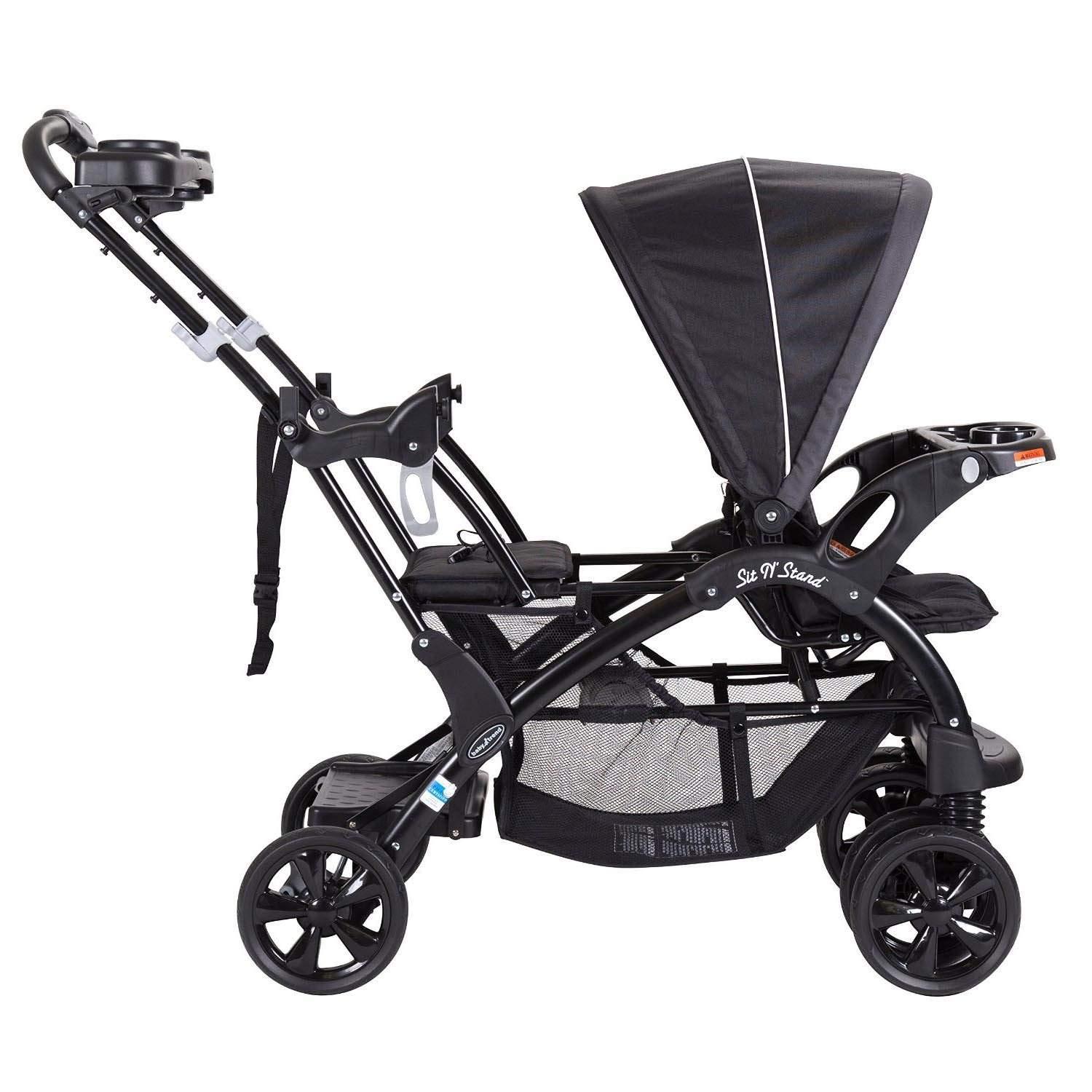 The Baby Trend sit N' Stand 5-in-1 Shopper plus stroller is perfect for your growing family. With the new compact and streamlined frame, our sit N' Stand 5-in-1 Shopper stroller has 5 modes of use – car seat travel system mode, car seat in the front seat with sibling on platform, child in the stroller seat only, child in the stroller seat with sibling sitting on bench, and child in the stroller seat with sibling standing. The front and back seats can hold kids up to 50lbs each. Sit N' Stand 5-in-1 Shopper plus offers ultimate storage solutions with its included bench tote and magnetec basket. The bench tote can be easily attached to the shopper's bench for extra storage, or it can be used separately as a shopping tote! Designed with mesh siding, easy-grip handle and perfect size, it holds 20lbs of your strolling necessities or groceries. With the innovative magnetec basket, parents can open and close the basket very quickly with the help of strong magnets to hold the basket closed. This practical extra-large basket and tote together can hold up to 50lbs of parents' Essentials – groceries, toys, diaper bags, etc. Strolling with our sit N' Stand Shopper stroller will be a breeze with your little ones. Your children will appreciate comfort Cabin, which includes a removable extra-long canopy with UPF 50+ protection, multi-position reclining seat, Deluxe fabrics and premium padding that will keep them safe and comfy, staying away from the harmful sun rays. Parents will love our parent premiums that include a modern parent console with multi-directional cell phone positioner and extra-deep cup holders. Plus, mom and dad now can easily access the large storage basket from the front or back!