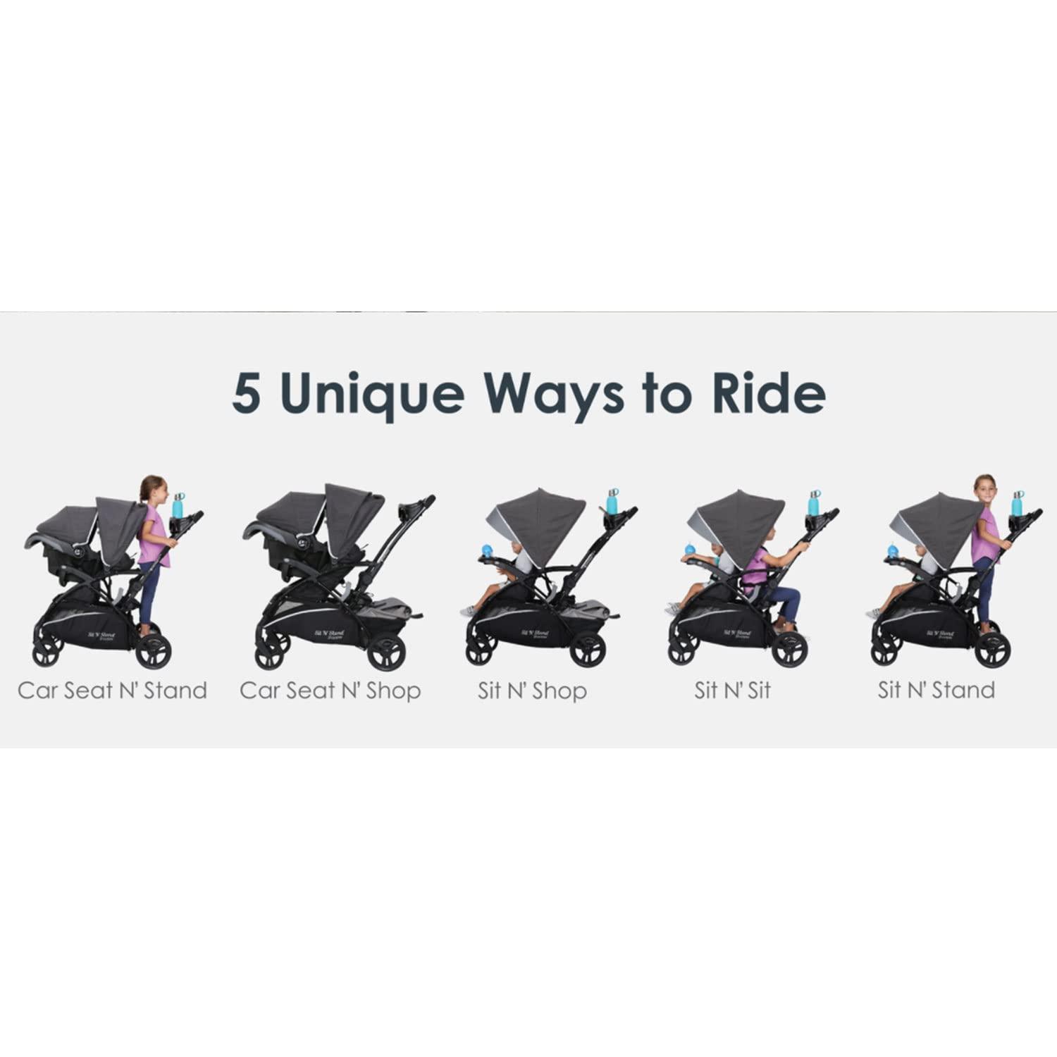 The Baby Trend Sit 'N Stand 5-in-1 Shopper Stroller is perfect for your growing family. With the new compact and streamlined frame, our Sit N? Stand 5-in-1 Shopper Stroller has 5 modes of use travel system mode, car seat in the front seat and older child standing on platform, child in the stroller seat only, child in the stroller seat with sibling sitting on bench, and child in the stroller seat with sibling standing. The front and back seats can hold kids up to 50lbs each. Strolling with our Sit 'N Stand Shopper Stroller will be a breeze for you and your little ones. Your children will appreciate Comfort Cabin, which includes removable extra-long canopy with UPF 50+ protection, multi-position reclining seat, deluxe fabrics and premium padding that will keep them safe and comfy, staying away from the harmful sun rays. Parents will love our Parent Premiums that have a modern parent console with multi-directional cell phone positioner and extra-deep cup holders. Mom and dad now can easily access the large storage basket in the front and back. With the innovative MagneTecBasket, parents can open and close the basket very quickly with the help of strong magnets to hold the basket closed. This practical extra-large basket can be extended and hold up to 30lbs of parents essentials, groceries, toys, diaper bags, etc.