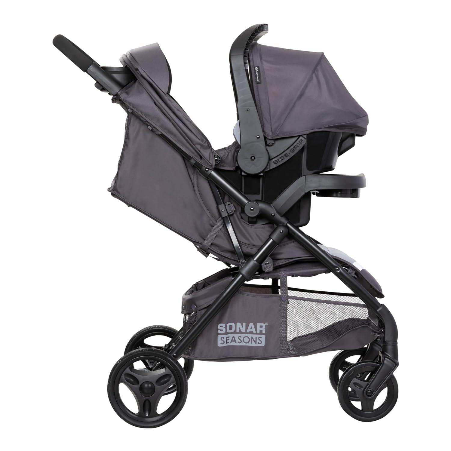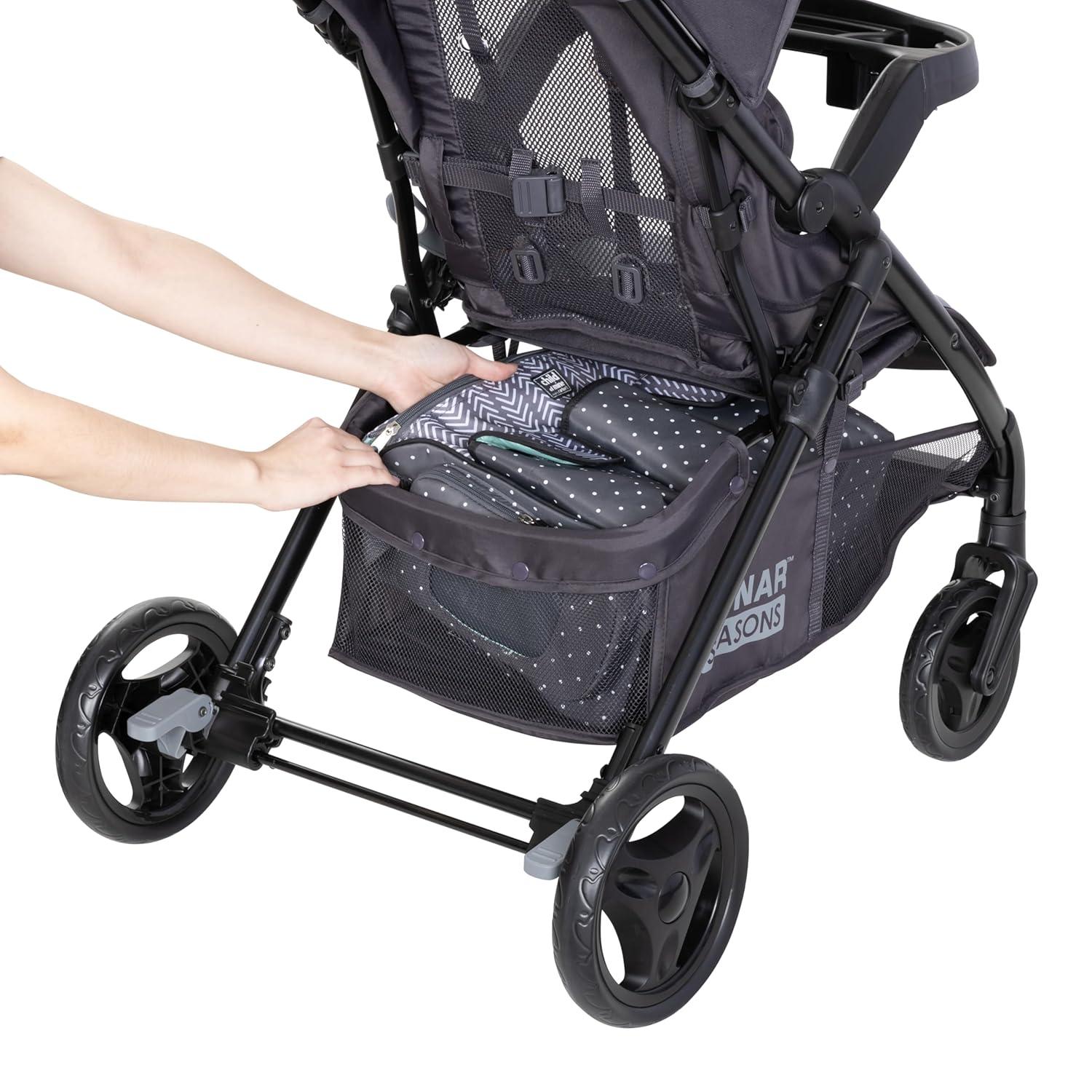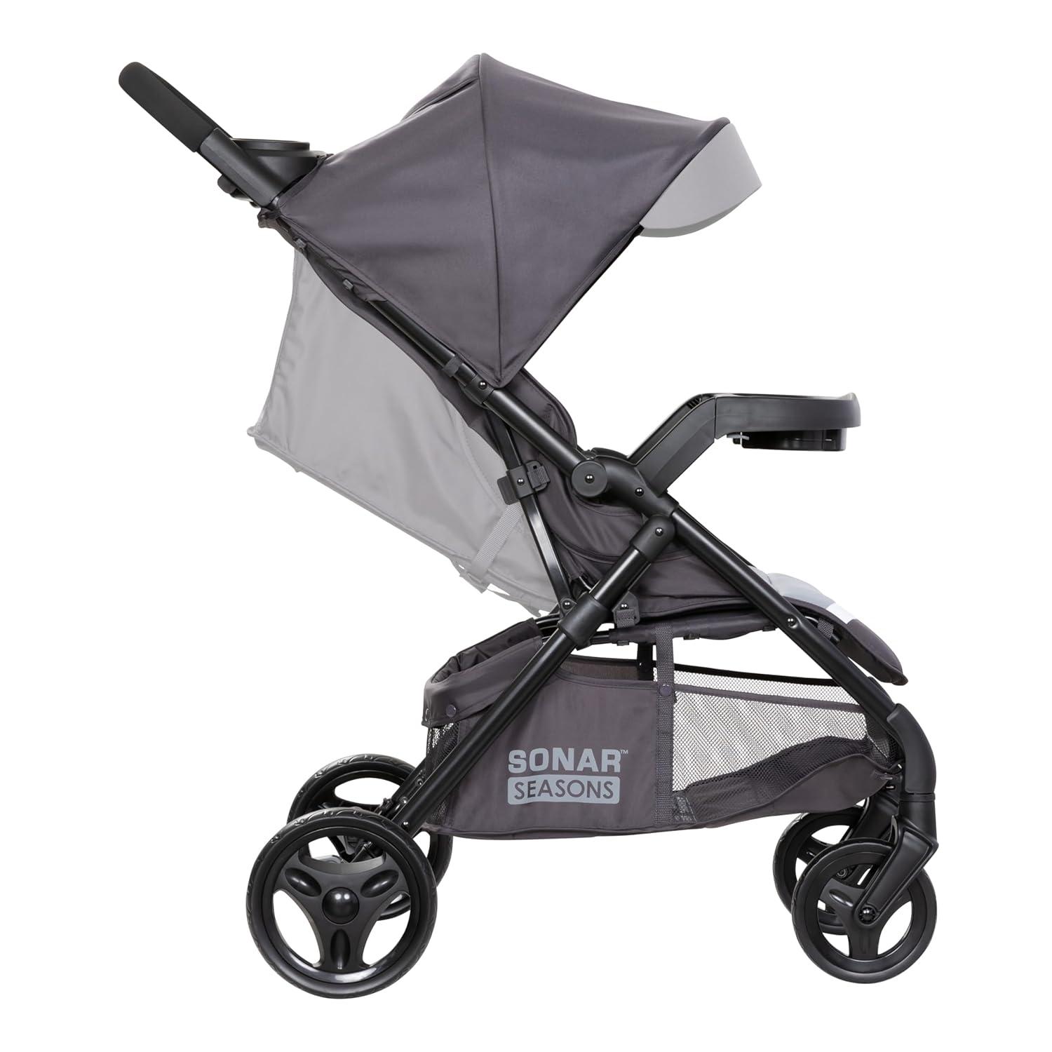 Whether it's Winter, Summer, Spring or Fall — strolling is a breeze with the Sonar Seasons Stroller by Baby Trend. This unique stroller can convert from a traditional backrest to a breathable, mesh backrest by rolling the seat back up. Once it is rolled up, the seat back can be used as a pillow or it can be stored behind the stroller seat. The Sonar Seasons has a large basket that has both front and rear access, as well as a parent tray and child tray with cup holders and storage.