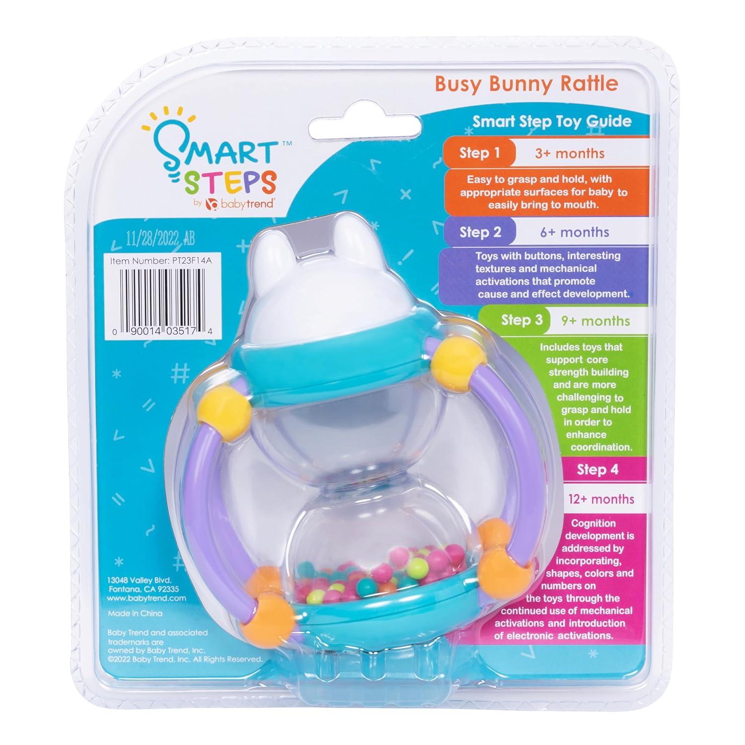 Whether at home or traveling, your baby's curiosity will be peaked with the Smart Steps Busy Bunny Rattle! The Busy Bunny encourages your child to reach and hold with multiple grasping points, supporting their hand-eye coordination. This STEM toy helps to develop your baby's cognitive skills by introducing cause and effect sequencing, while stimulating their auditory and visual cues with bright colors and rattle beads. This toy is recommended for children three months and up, and is safe for baby to bring to mouth. Recommended for babies 3 months and up.