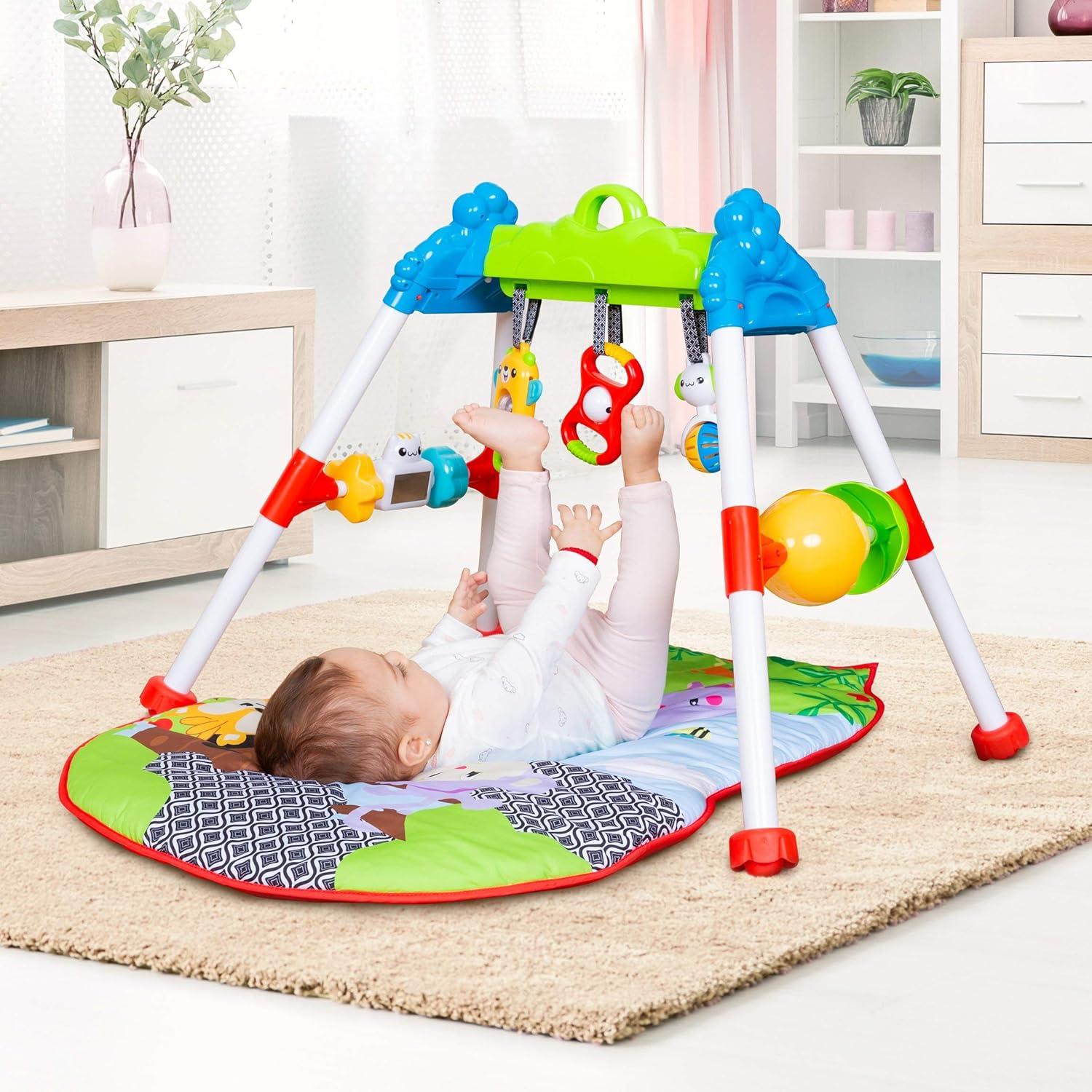 REMOVABLE TOYS CAN BE TAKEN ANYWHERE: The included three hanging toys promote children’s cause and effect skills and encourage interactions. The Jammin’ Gym’s toys rattle and have an easy grip, allowing kids to grasp and hold.